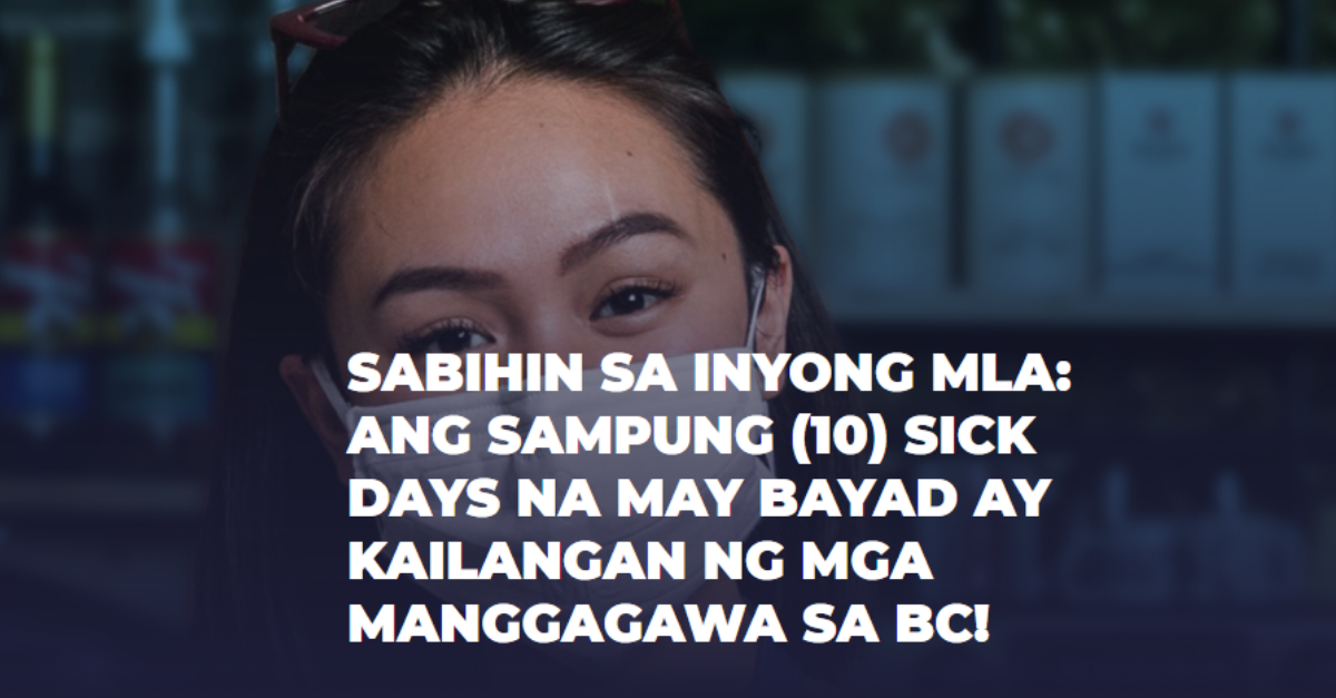 (Mula sa mga Teritoryong hindi isinuko ng mga Squamish, Tsleil-Waututh and Musqueam - Vancouver, BC) Naglunsad ang BCFED ng isang digital na kampanya upang hikayatin ang gobyerno ng BC na magpatupad ng Sick Leave program na sampung araw at babayaran ng pinagtatrabahuhan. Ang detalye ng programang ito ay ipapahayag sa darating na mga buwan.